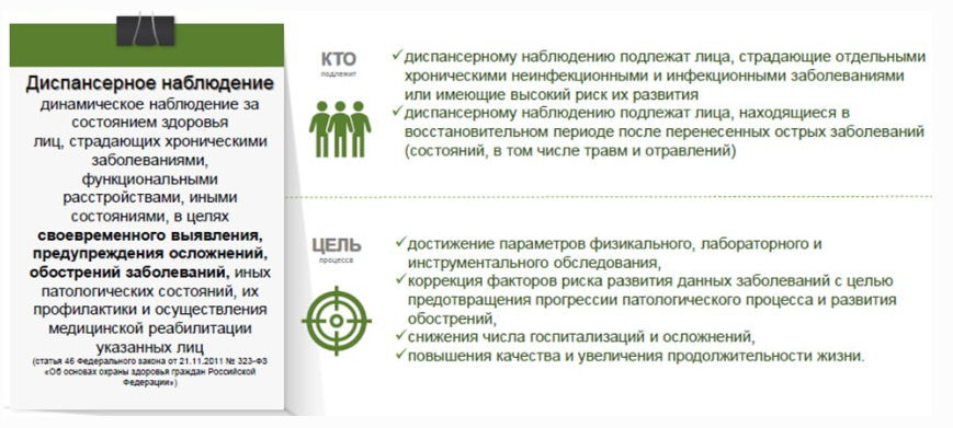 Диспансерному наблюдению подлежат лица, страдающие отдельными хроническими неинфекционными и инфекционными заболеваниями или имеющие высокий риск их развития, а также лица, находящиеся в восстановительном периоде после перенесенных острых заболеваний (состояний, в том числе травм и отравлений).